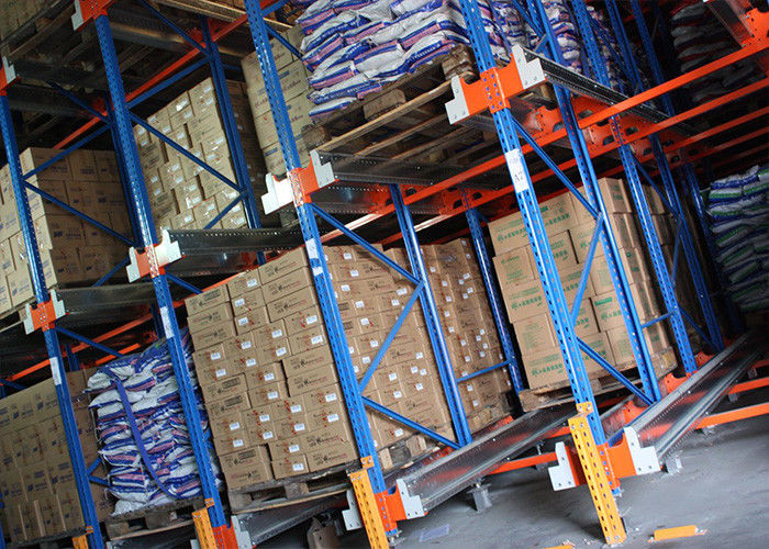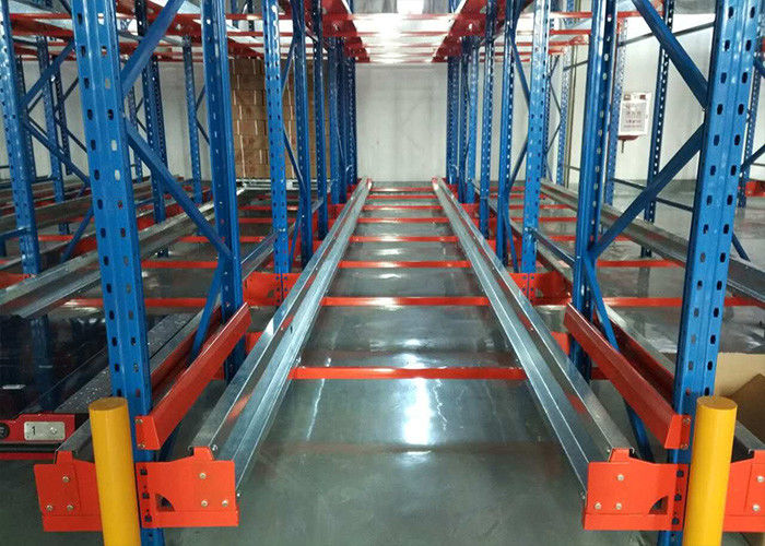Een shuttlesysteem bestaat uit een ondersteunend rek, een shuttlespoor en een shuttlecart, die op de rails draait en wordt aangedreven door een elektromotor.Het heeft ook een platform aan de bovenkant dat kan op- en neerheffen. The lifting action is required to lift a pallet that is placed on the rail and then the electric motor moves the cart with the pallet on top into the rack in order to deposit the pallet in its right position.